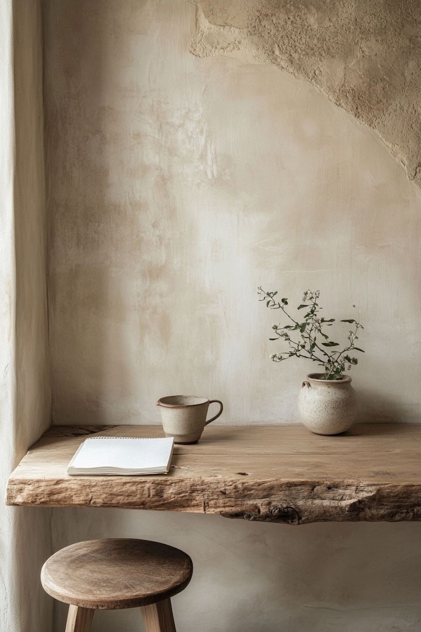風格特色:多使用天然材質(木、土、麻),強調不對稱與時間留下的軌跡。牆面多帶有首刷痕跡、有些裂紋的陶器,更能提升整體味道。